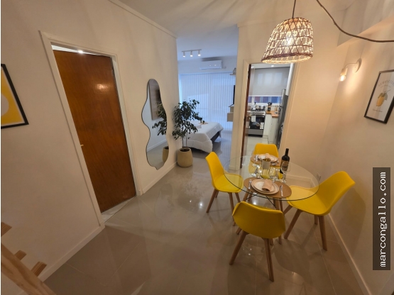 * Ambiente dividido con amplio ventanal de piso a techo súper luminoso, cama sommier a estrenar de dos plazas, resplado de cama con mesas de luz incorporadas, mesa con 4 sillas a estrenar, rac con TV Smart 32 pulgadas nuevo, aire acondicionado frio calor, plantas, perchero de pie, cortinas, acolchado y decoración.
